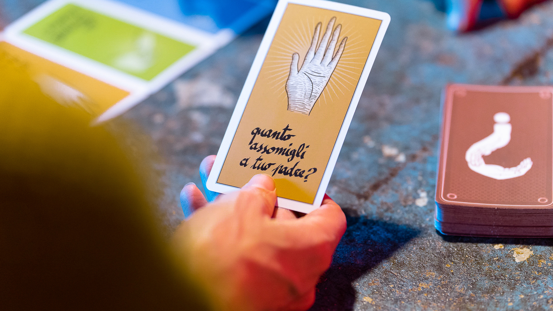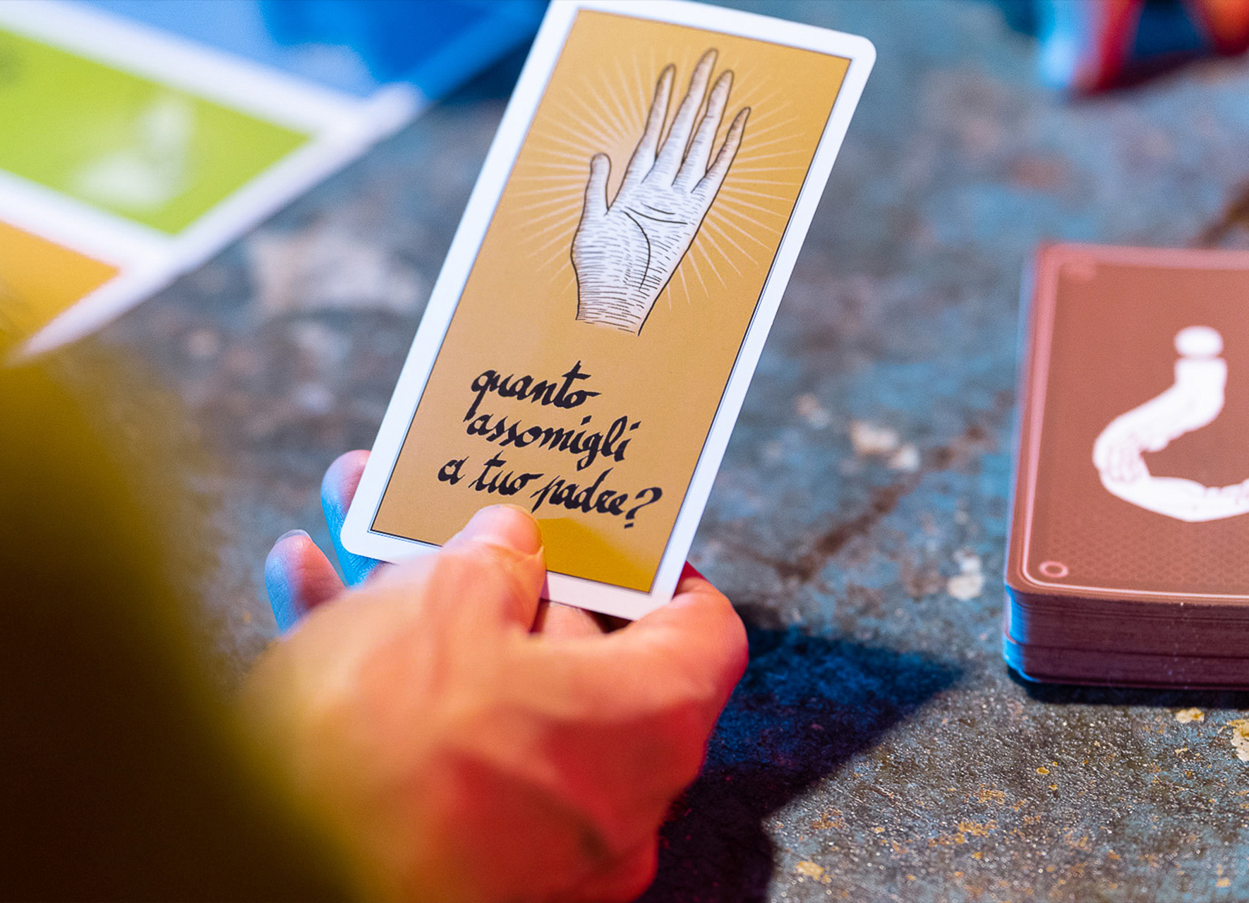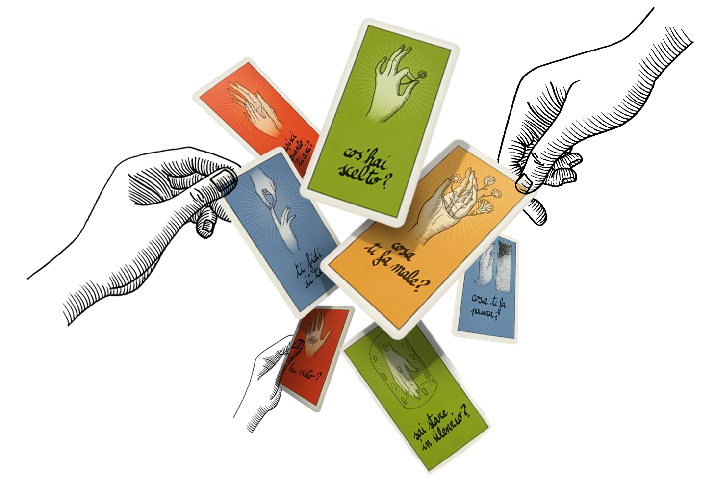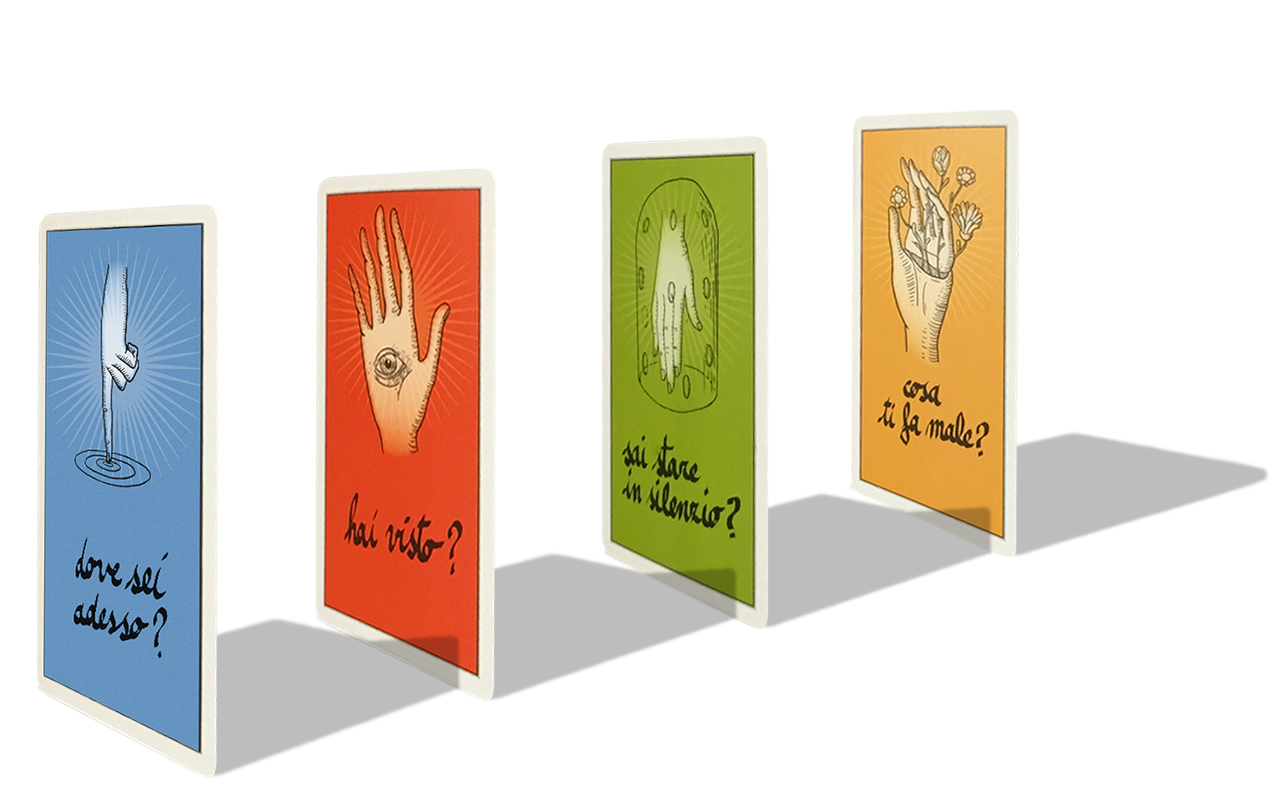 Per ognuna di loro ho disegnato una mano ispirata da quella domanda specifica, che potesse aiutare chi gioca a rispondere in maniera profonda e libera.